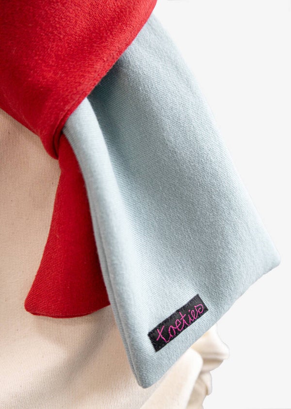 De Vlakdoek is een heerlijke, lange sjaal die soepel om de nek valt. De voorkant bestaat uit zes kleurvlakken in twee kleuren naar keuze, de achterkant uit twee vlakken - zo past deze sjaal bij elke outfit.