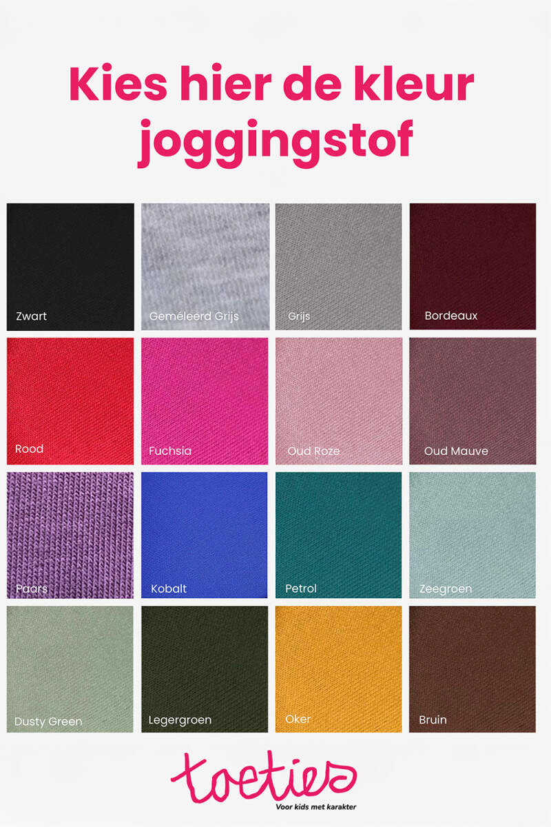 De joggingstoffen die we gebruiken zijn OEKO-TEX Standaard 100. Dat is de strengste categorie en staat garant voor stoffen die veilig zijn voor baby's en jonge kinderen.